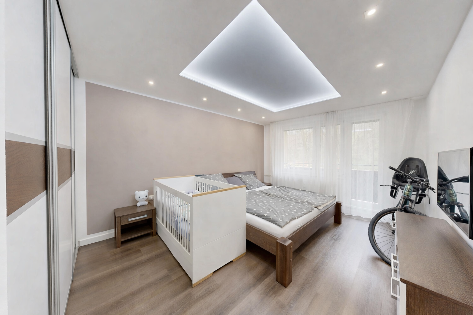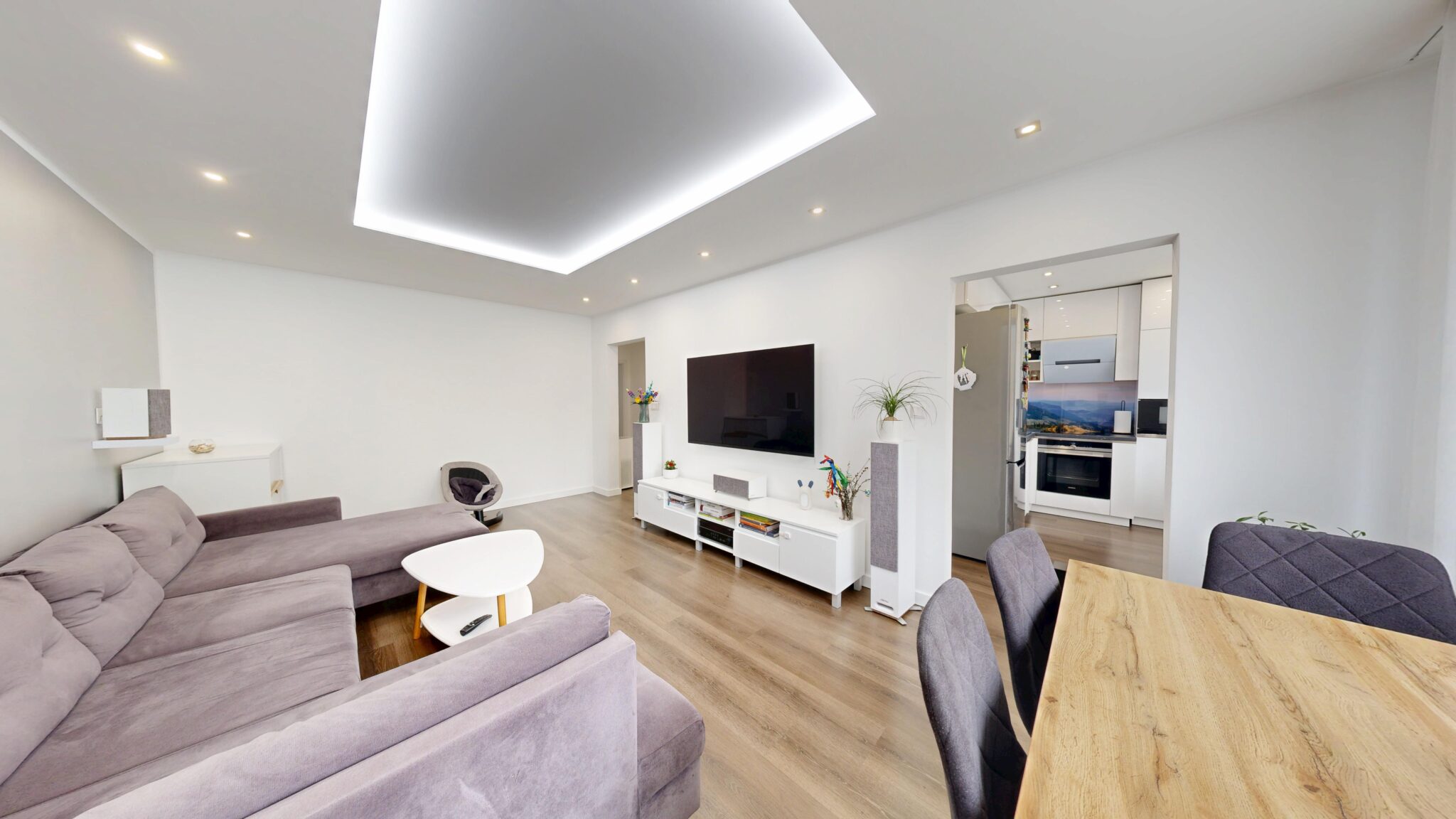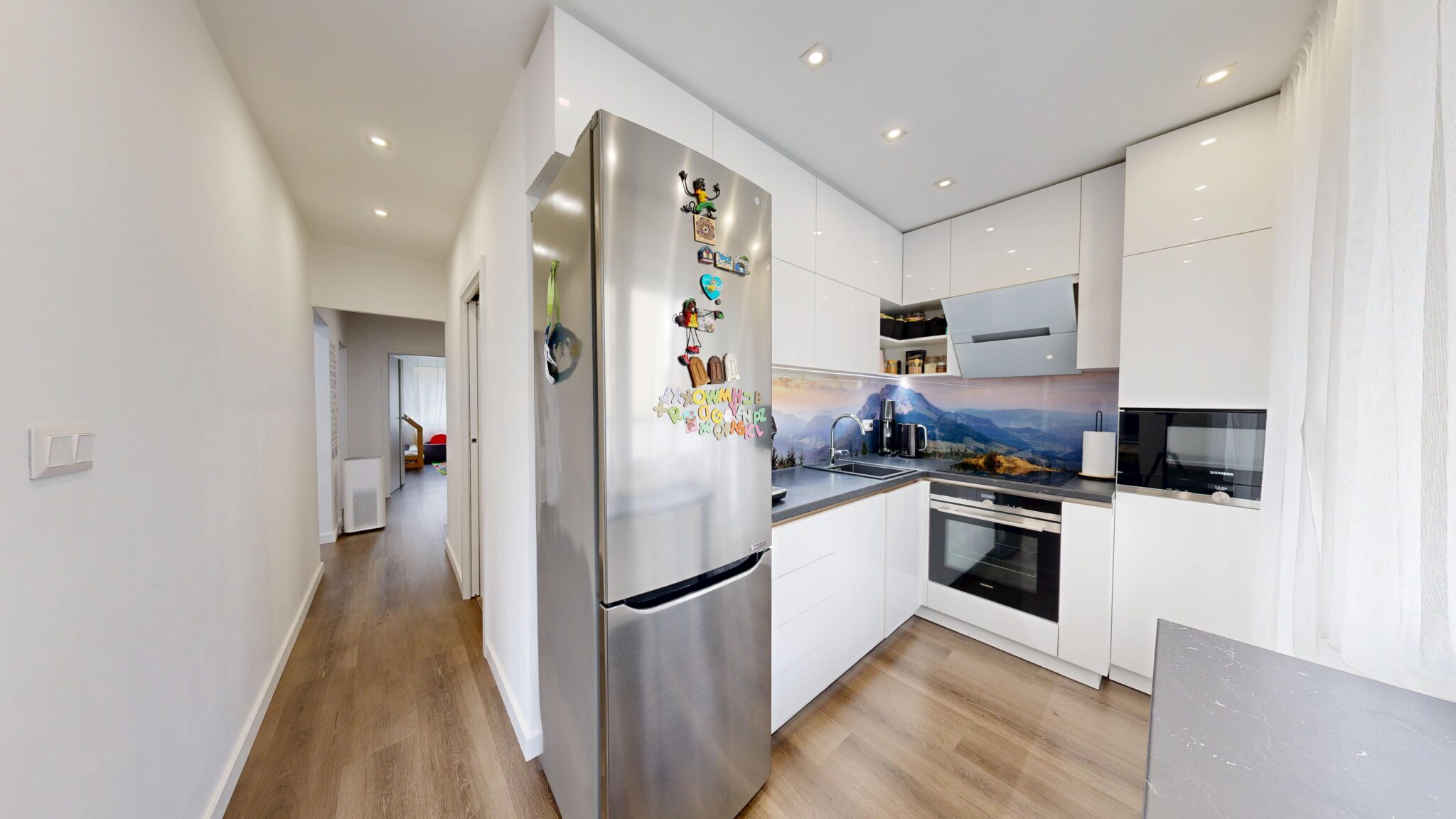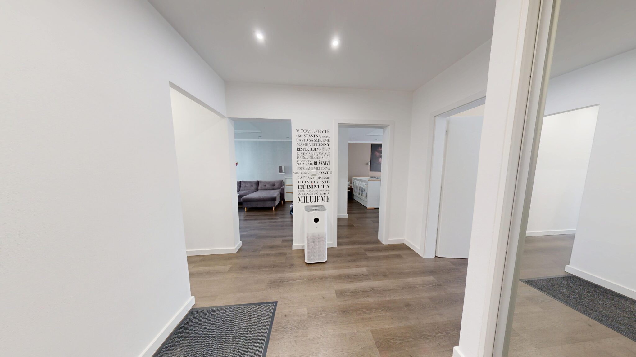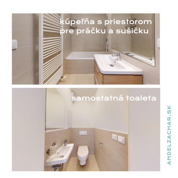 V byte je osadená nadštandardná sanita a kvalitné batérie, vrátane termostatickej batérie v sprchovom kúte aj vo vani. Kuchynská linka v bielom vysokom lesku s tip-on systémom a tlmeným dobehom je vybavená vstavanými spotrebičmi Siemens. Komfort bývania dopĺňajú posuvné dvere do steny Eclisse, vstavané skrine na chodbe, v spálni aj v tretej izbe, bezpečnostné vstupné dvere Exklusív, plastové okná Slovaktual s trojsklom a nové radiátory.