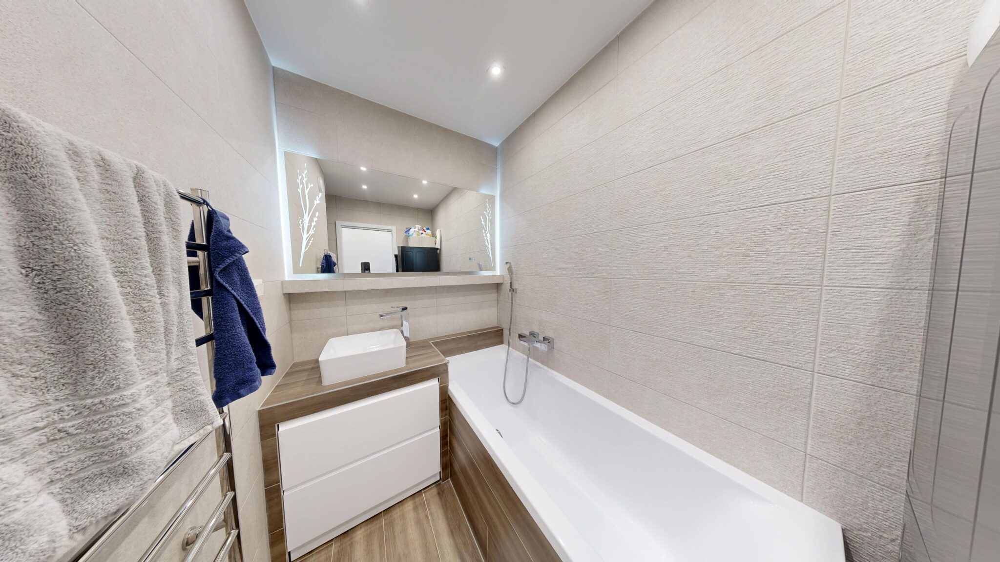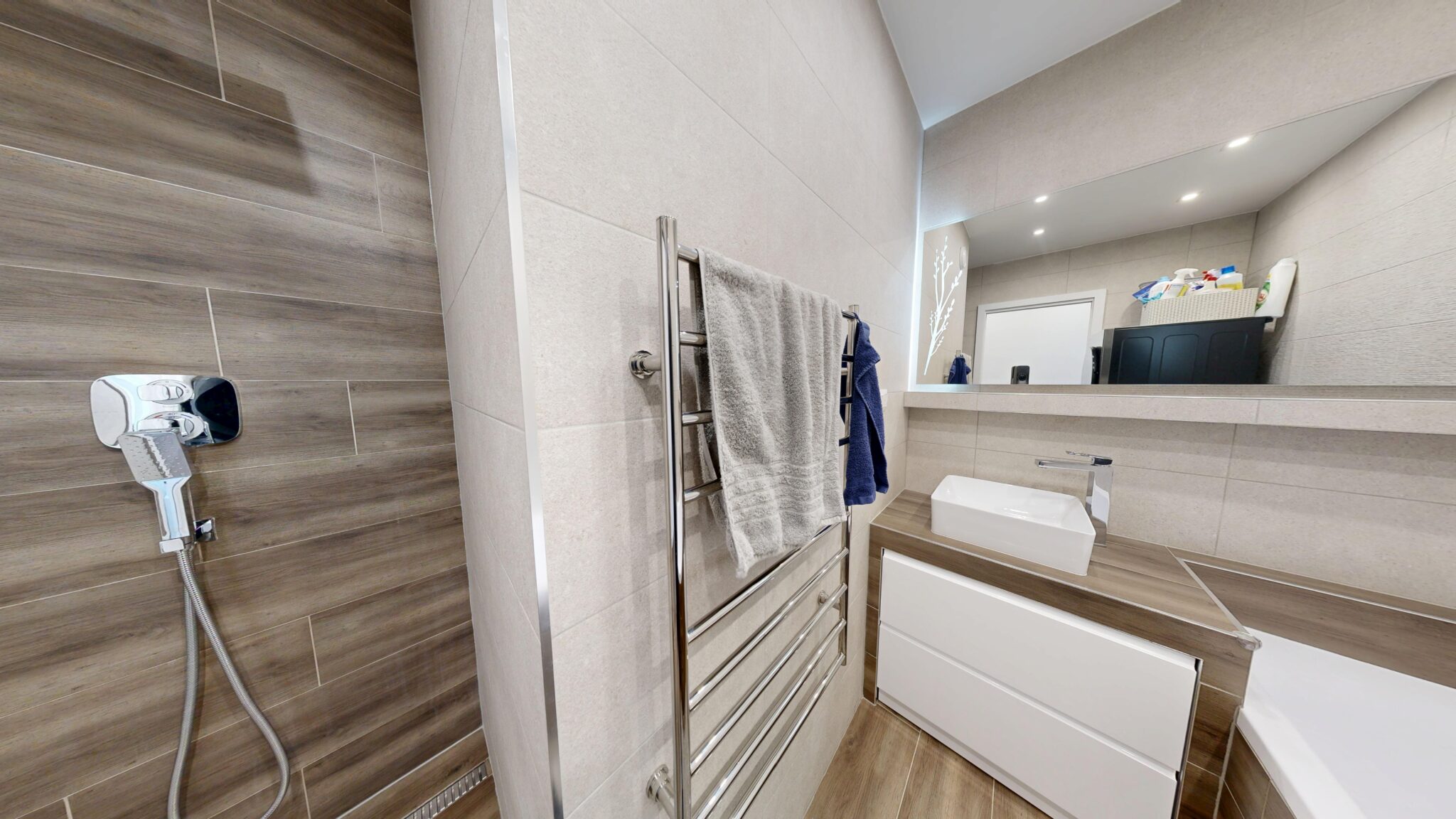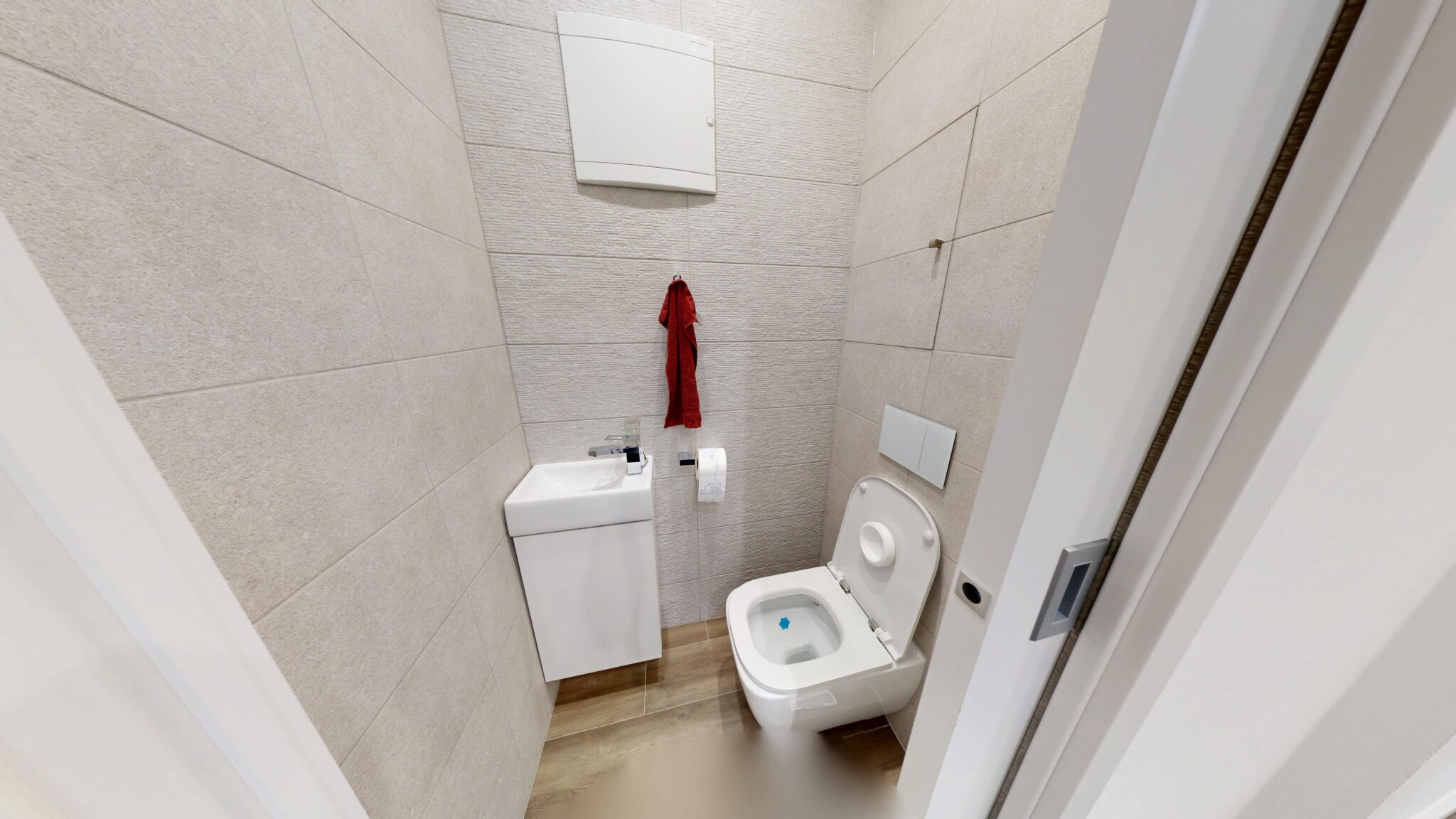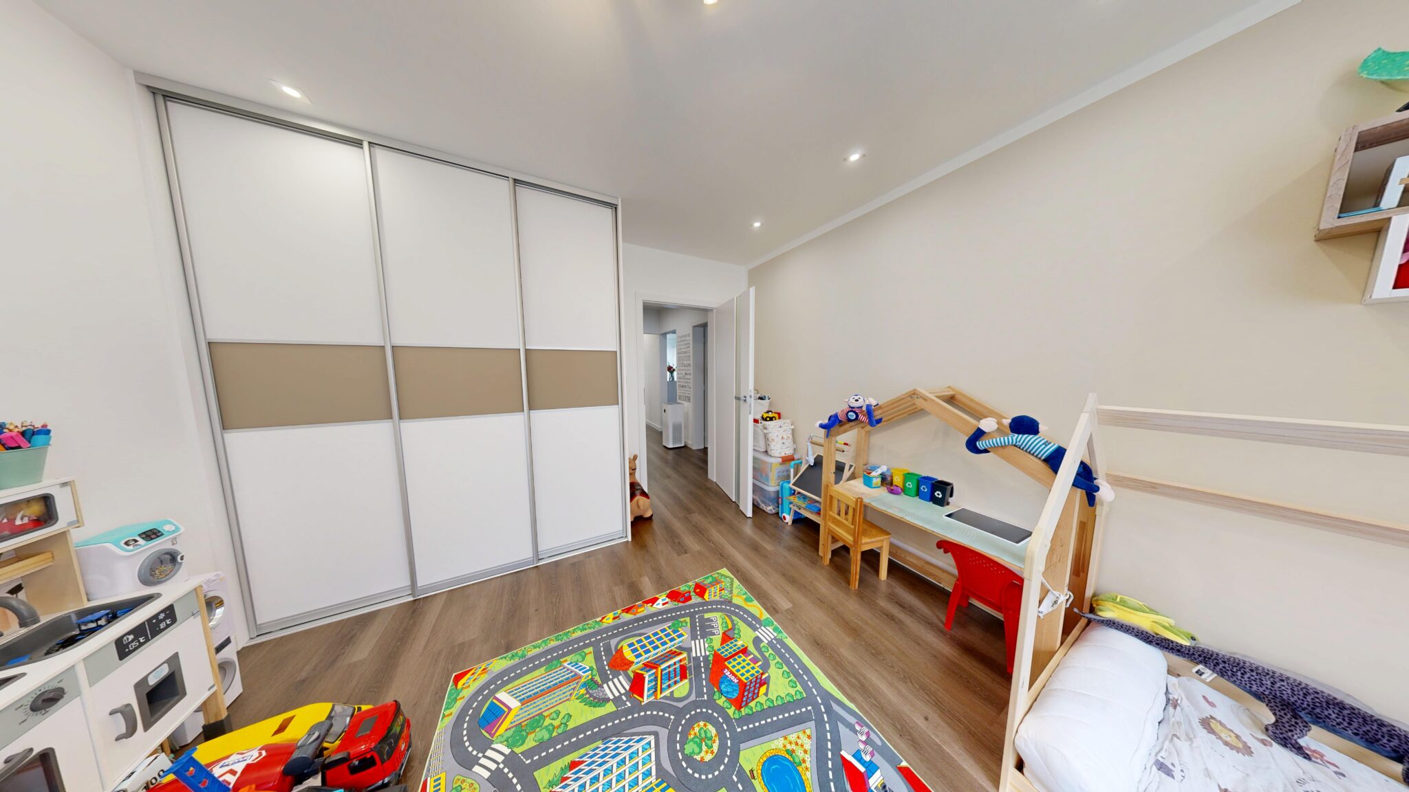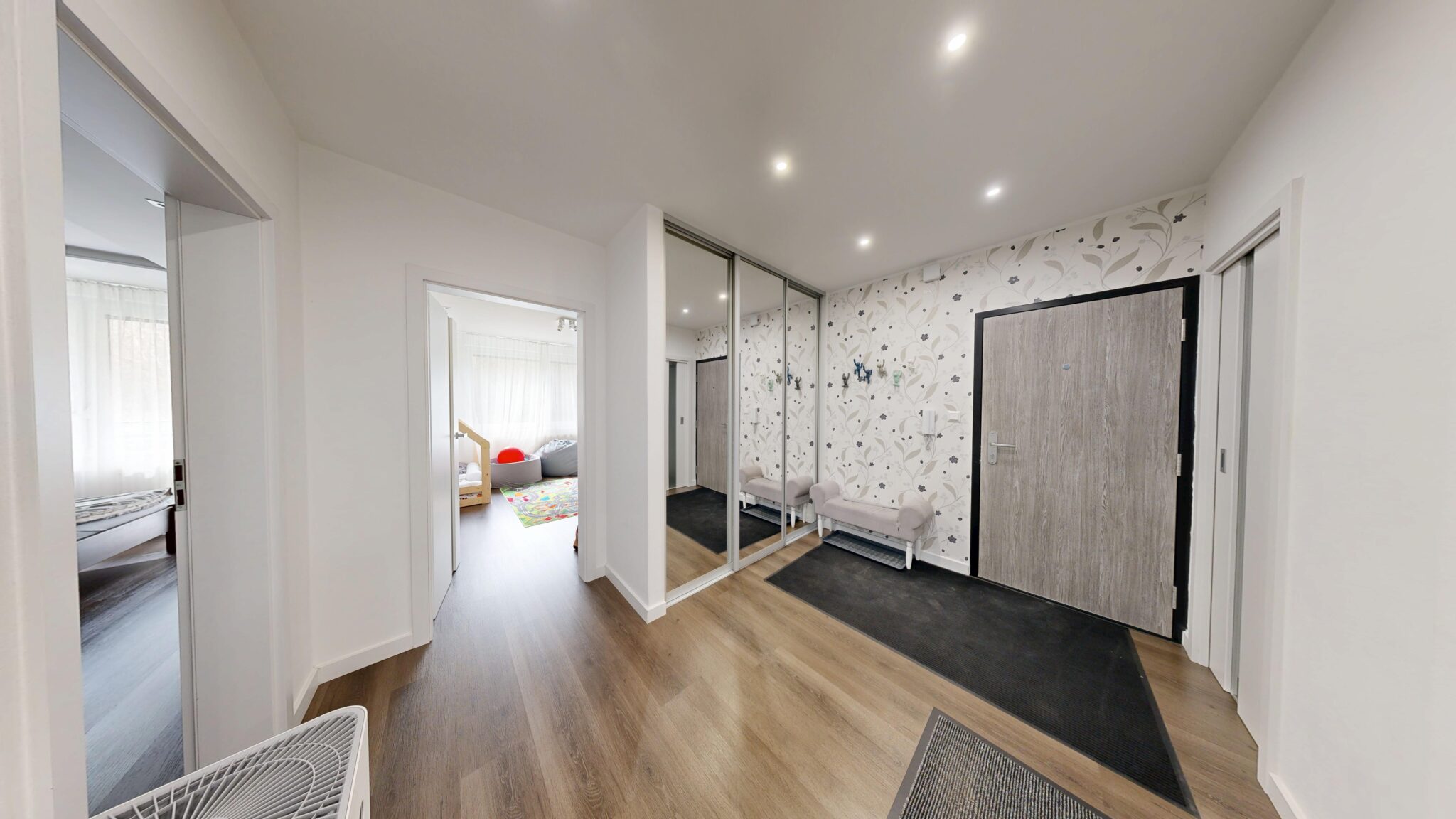 V byte je osadená nadštandardná sanita a kvalitné batérie, vrátane termostatickej batérie v sprchovom kúte aj vo vani. Kuchynská linka v bielom vysokom lesku s tip-on systémom a tlmeným dobehom je vybavená vstavanými spotrebičmi Siemens. Komfort bývania dopĺňajú posuvné dvere do steny Eclisse, vstavané skrine na chodbe, v spálni aj v tretej izbe, bezpečnostné vstupné dvere Exklusív, plastové okná Slovaktual s trojsklom a nové radiátory.