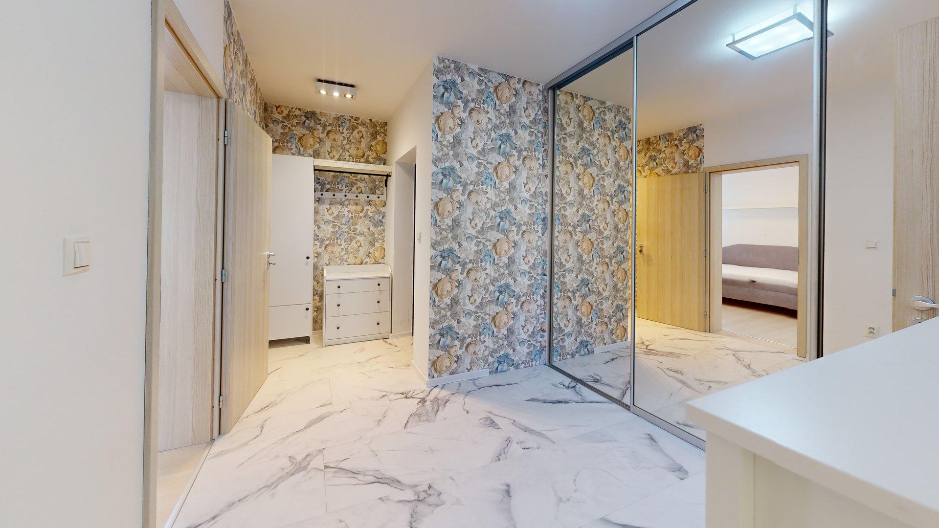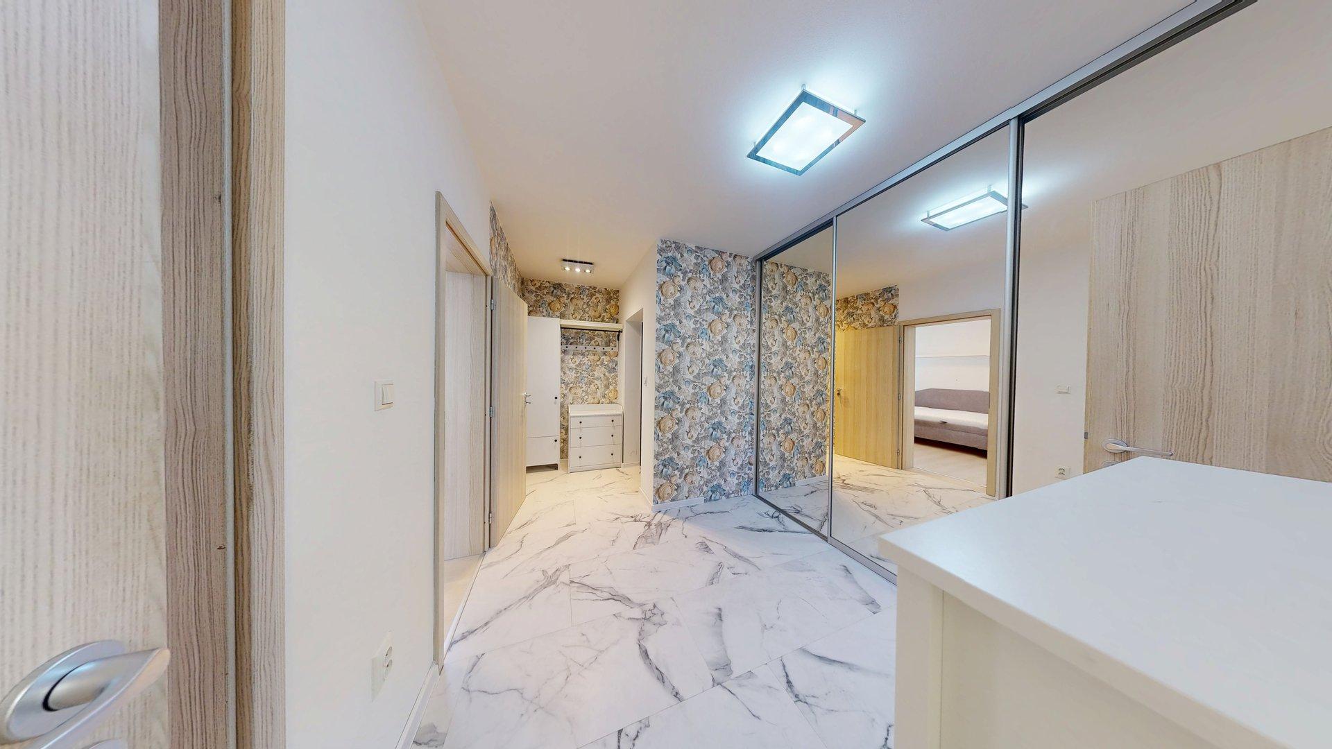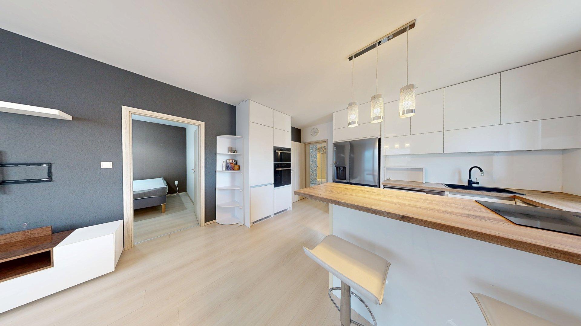 Byt má veľmi praktickú dispozíciu, pozostáva z obývacej časti prepojenej s kuchyňou, dvoch samostatných izieb, kúpeľne a samostatnej toalety. Interiér je ladený v modernom štýle s dôrazom na svetlosť a čisté línie, pričom veľkým benefitom je aj dostatok úložného priestoru vrátane priestrannej vstavanej skrine na chodbe. Kuchyňa je kompletne vybavená vstavanými spotrebičmi vrátane rúry, mikrovlnnej rúry, umývačky riadu a americkej chladničky. Súčasťou bytu je aj práčka a sušička, čo zabezpečuje komfortné každodenné fungovanie. Byt je zároveň klimatizovaný a prenajíma sa zariadený ako na fotkách.