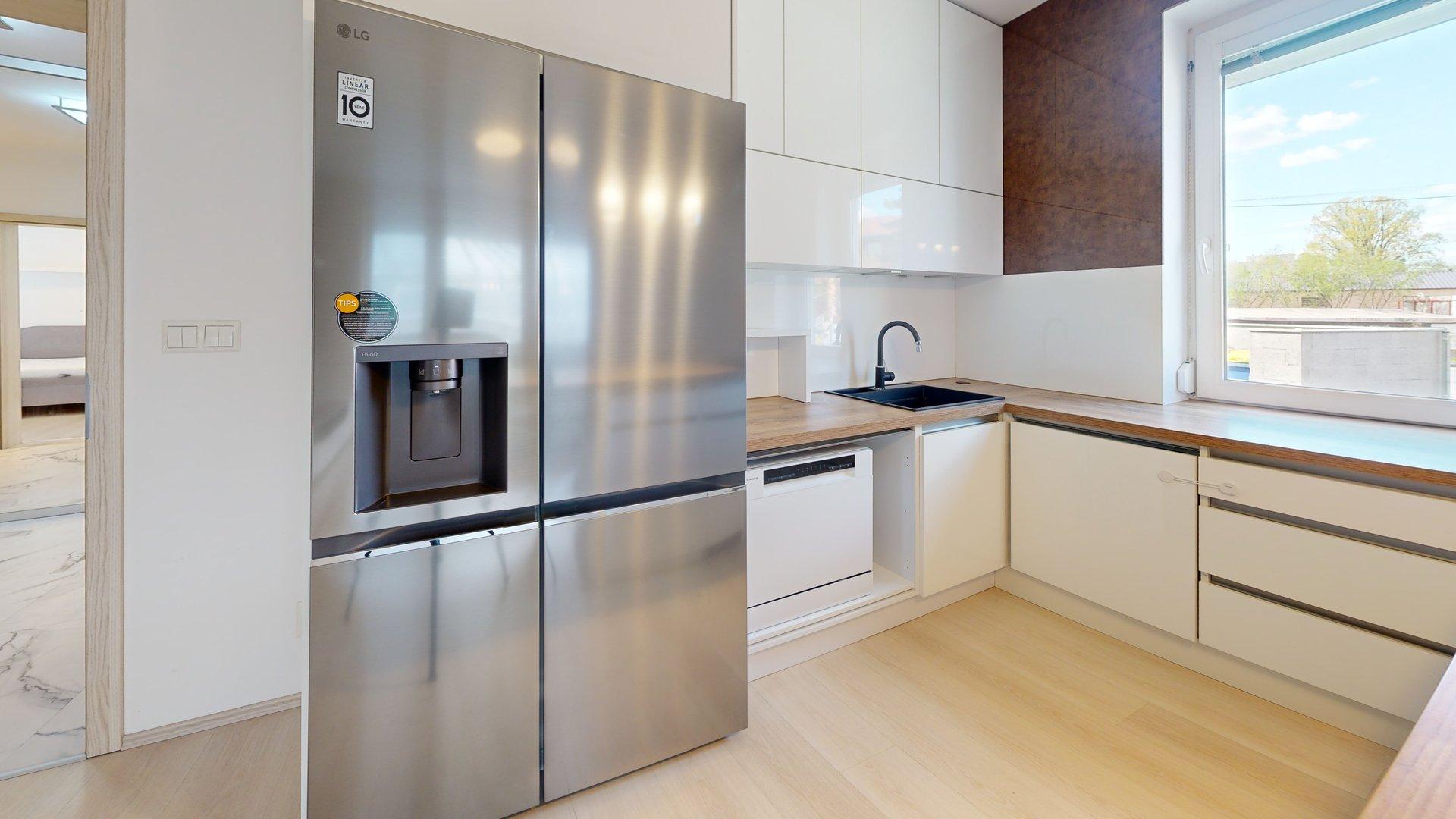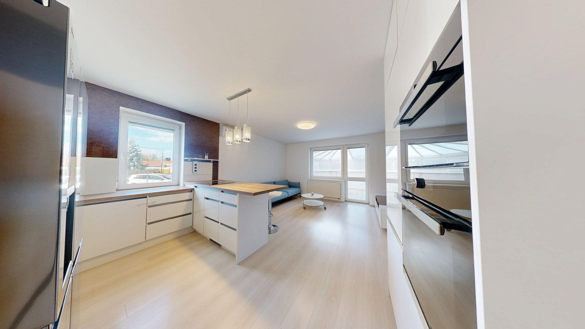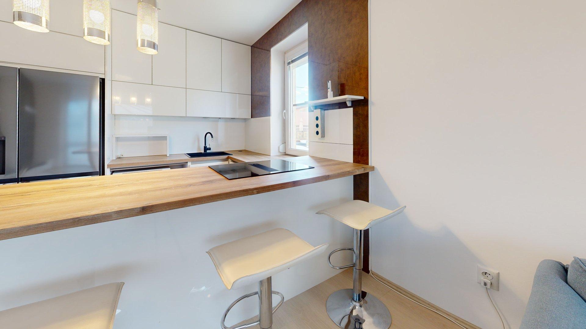 Byt má veľmi praktickú dispozíciu, pozostáva z obývacej časti prepojenej s kuchyňou, dvoch samostatných izieb, kúpeľne a samostatnej toalety. Interiér je ladený v modernom štýle s dôrazom na svetlosť a čisté línie, pričom veľkým benefitom je aj dostatok úložného priestoru vrátane priestrannej vstavanej skrine na chodbe. Kuchyňa je kompletne vybavená vstavanými spotrebičmi vrátane rúry, mikrovlnnej rúry, umývačky riadu a americkej chladničky. Súčasťou bytu je aj práčka a sušička, čo zabezpečuje komfortné každodenné fungovanie. Byt je zároveň klimatizovaný a prenajíma sa zariadený ako na fotkách.