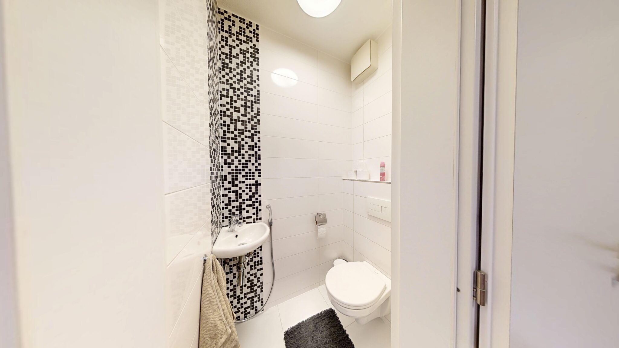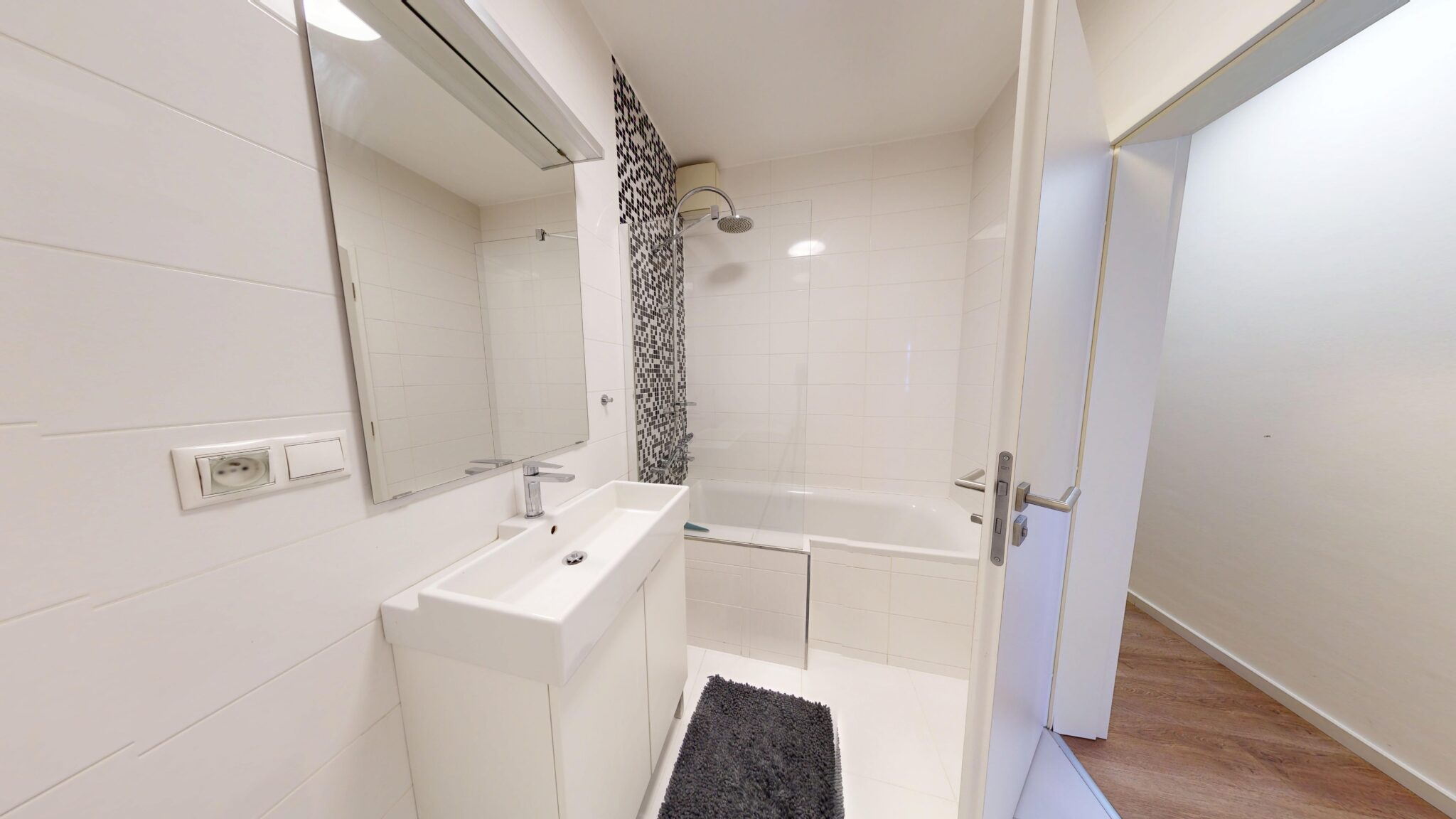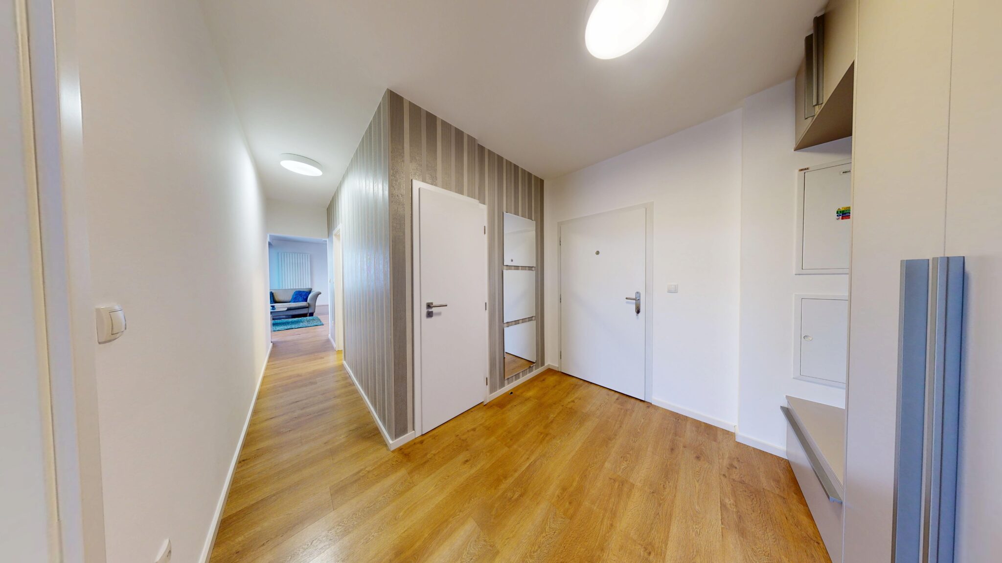 Po otvorení dverí vstupujeme do haly so vstavanou skriňou a po pravej strane máme samostatnú toaletu. Oproti dverám nachádzame vstup do spálne s manželskou posteľou a vstavanou skriňou. Vstup do kúpeľne je priamo z chodbovej časti. Chodbový prechod ukončuje vstup do priestrannej a osvetlenej obývačky so vstupom do loggie, ktorá je dispozične prepojená s kuchyňou.