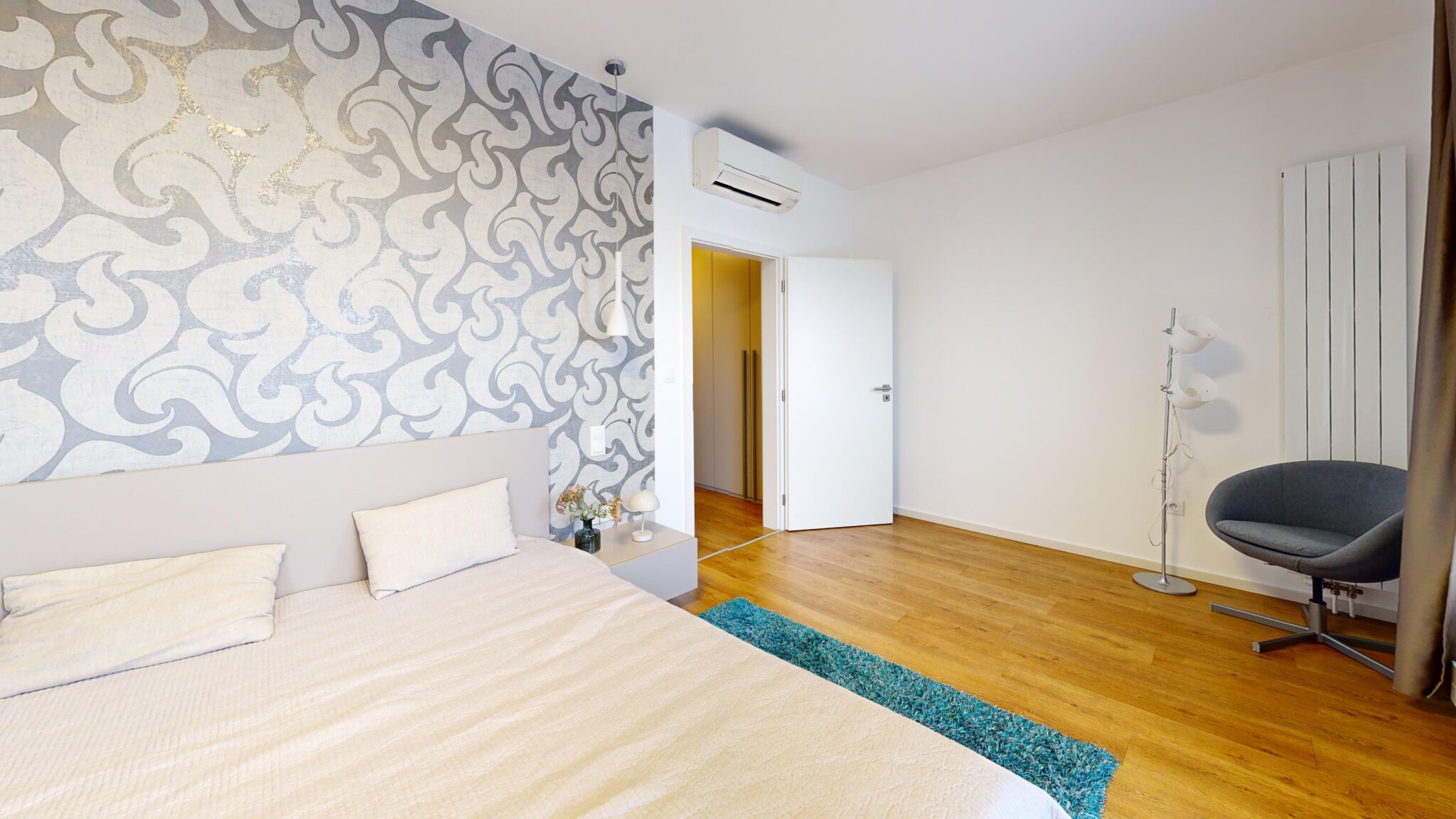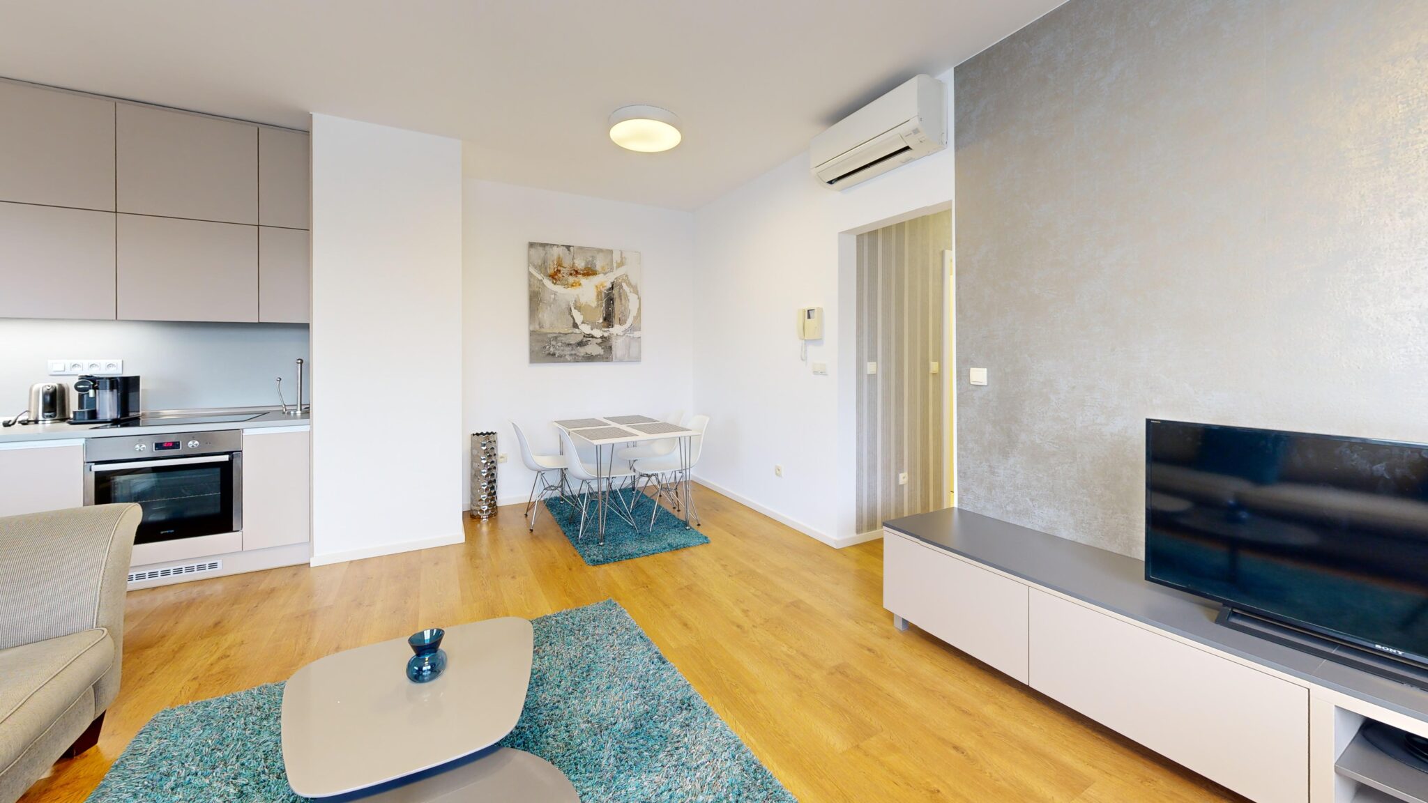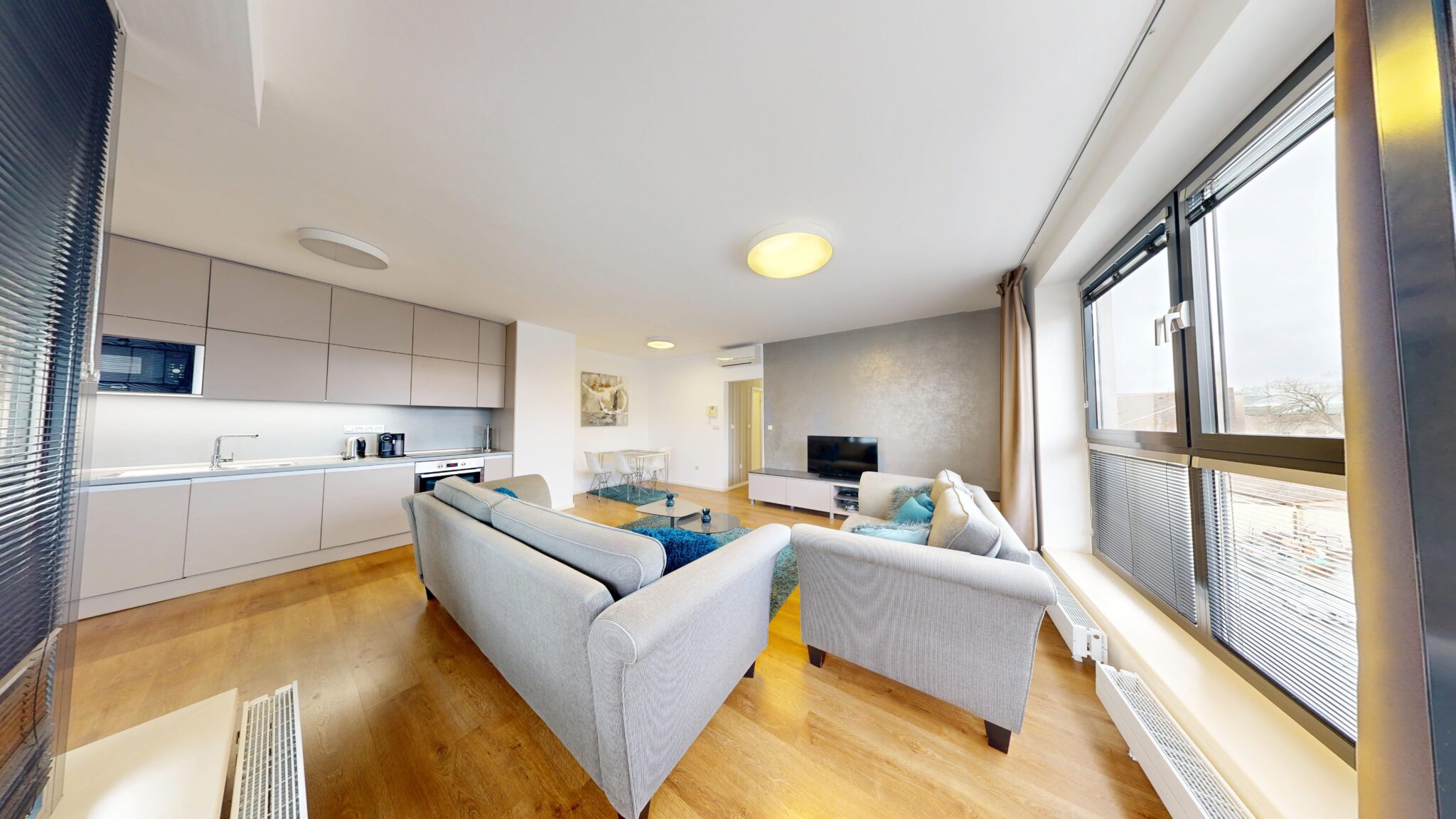Byt je moderný a má 2 klimatizačné jednotky. V bytovom dome sú 4 nadzemné podlažia obslúžené výťahom a suterén s kobkami a podzemnou garážou na vstup cez diaľkové ovládanie. Prenájom je ladený pre 2 dospelé osoby a bez zvierat.